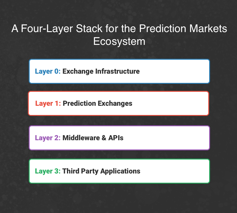 Before diving into the prediction markets ecosystem and its analysis, I want to introduce the framework I use to break it down into a four layer stack.